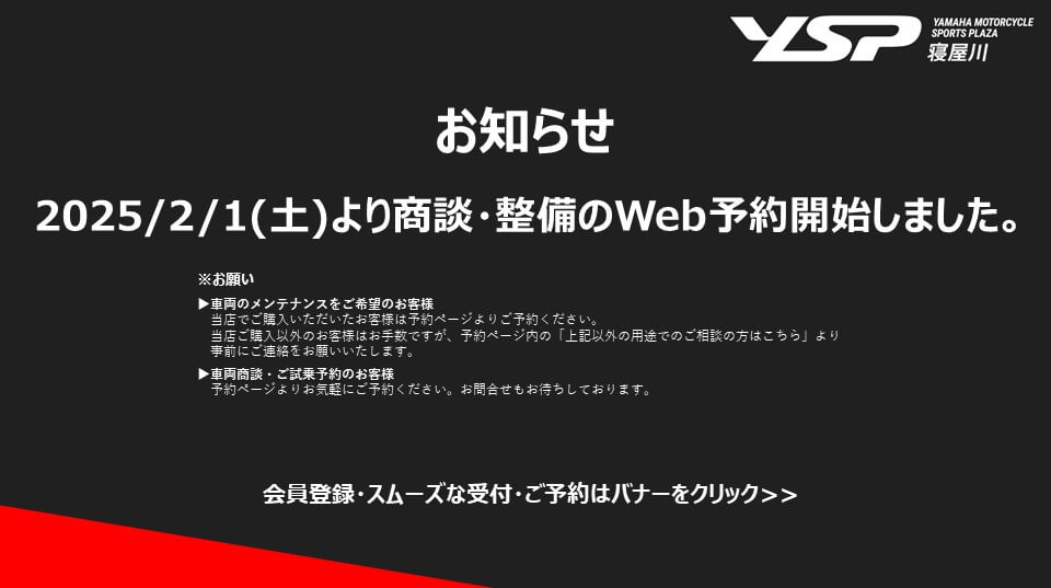 延長保証や盗難保証、免許取得サポートからロードサービスまで、ヤマハバイク専門店 だから実現できる充実のサービスメニュー。 YSP寝屋川・YSP枚方南の2店舗ネットワークでお客様の楽しいバイクライフをサポート!