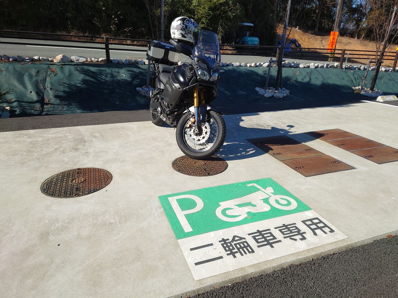 バイク専用駐車場にバイクを止めて
